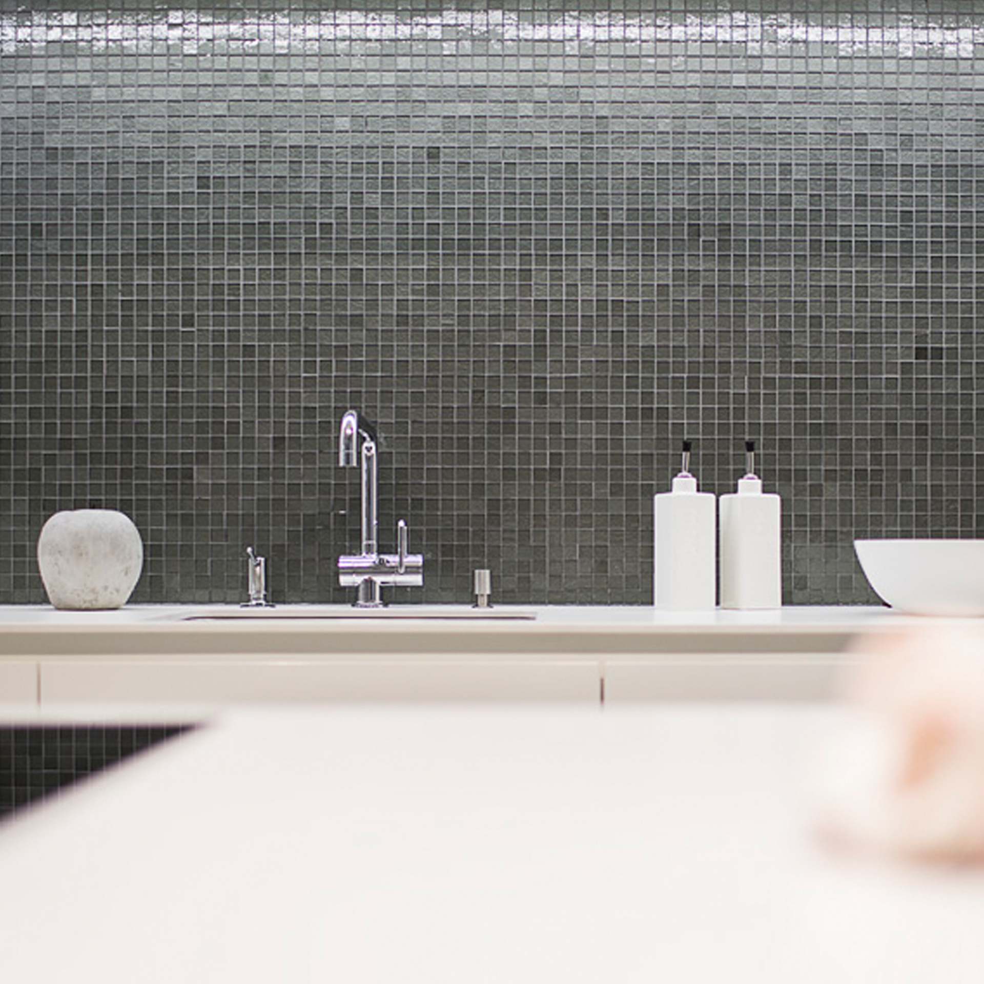 „Wieder ein eindrucksvoller Beweis, wie praktisch Schönes sein kann: pflegeleichte Küchenrückwand aus lebendig schillernden Mosaikplättchen.“